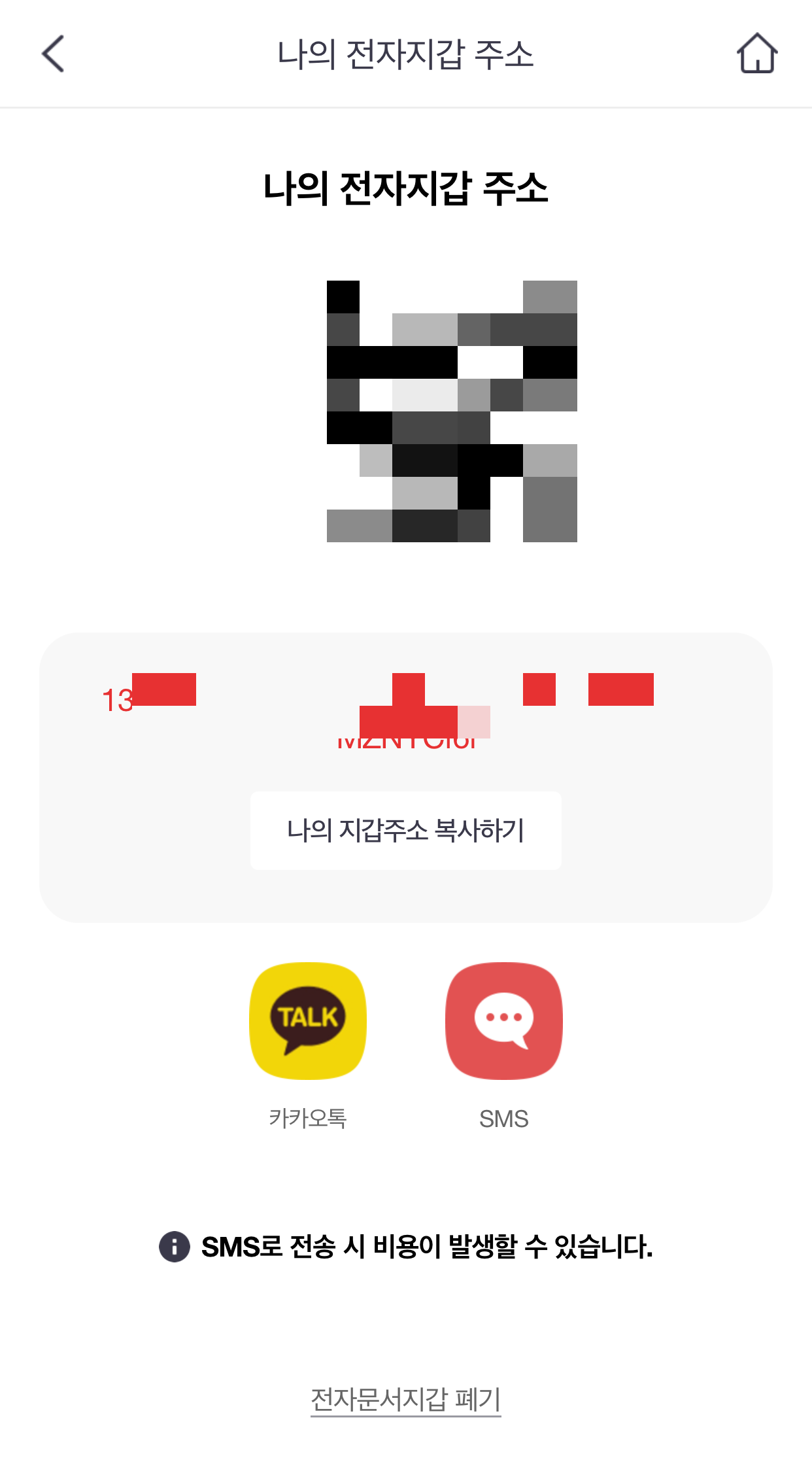 전자지갑 주소에 나오는 QR코드 또는 하단에 영문과 숫자의 조합으로 나오는 지갑주소를 복사해서 수취해야 하는 기관의 전화번호 또는 담당자 카카오톡으로 보내면 됩니다.