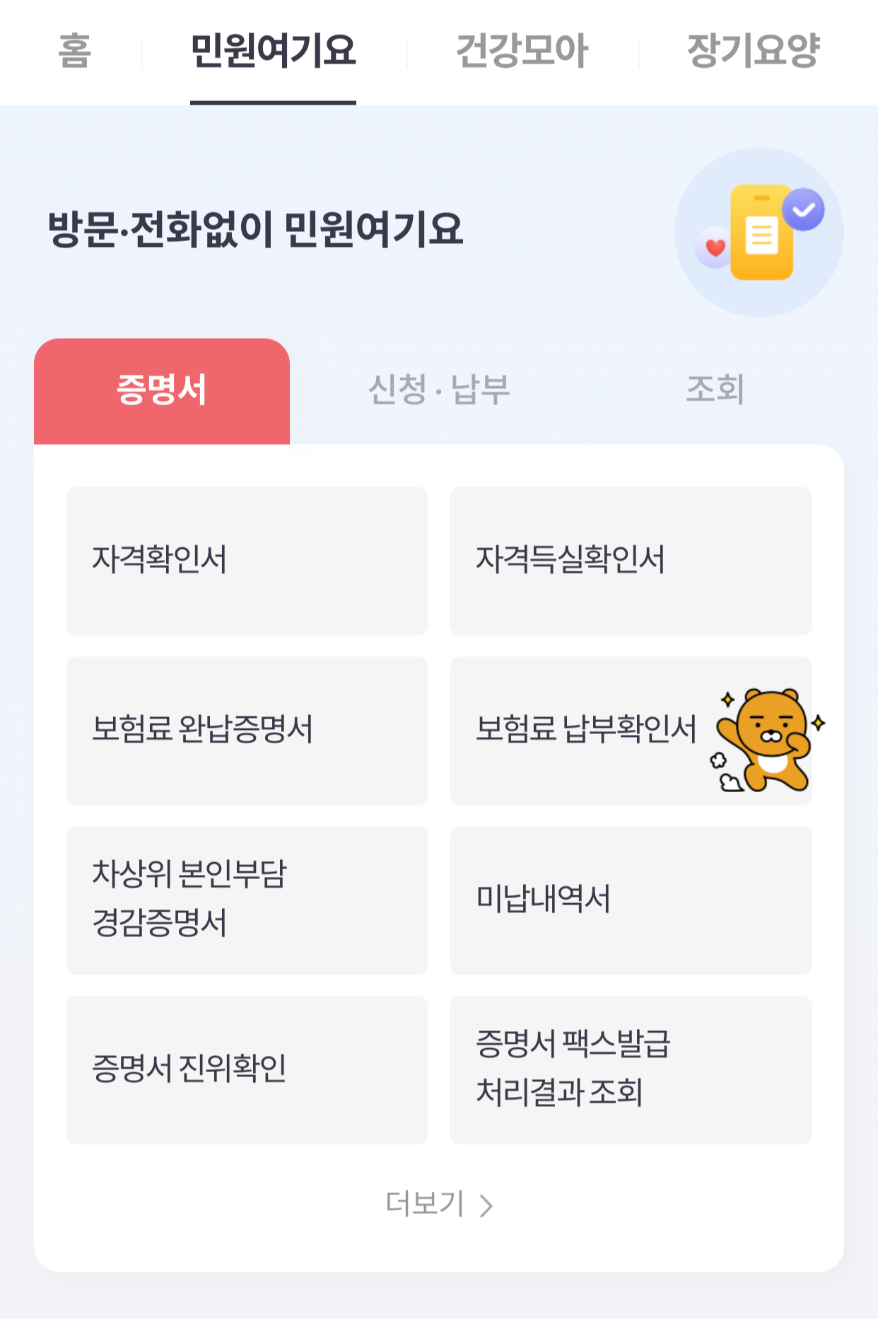 이제 더 건강보험 앱 홈 화면을 만날 수 있습니다. 상단의 민원여기요 탭에서 자주 사용되는 메뉴로 증명서들을 볼 수 있는데요. 건강보험자격확인서, 자격득실확인서, 건강보험료 미납내역서, 건강보험료납부 등 증명서 팩스발급 등의 메뉴와 함께 "건강보험료 납부확인서"메뉴를 확인할 수 있습니다.