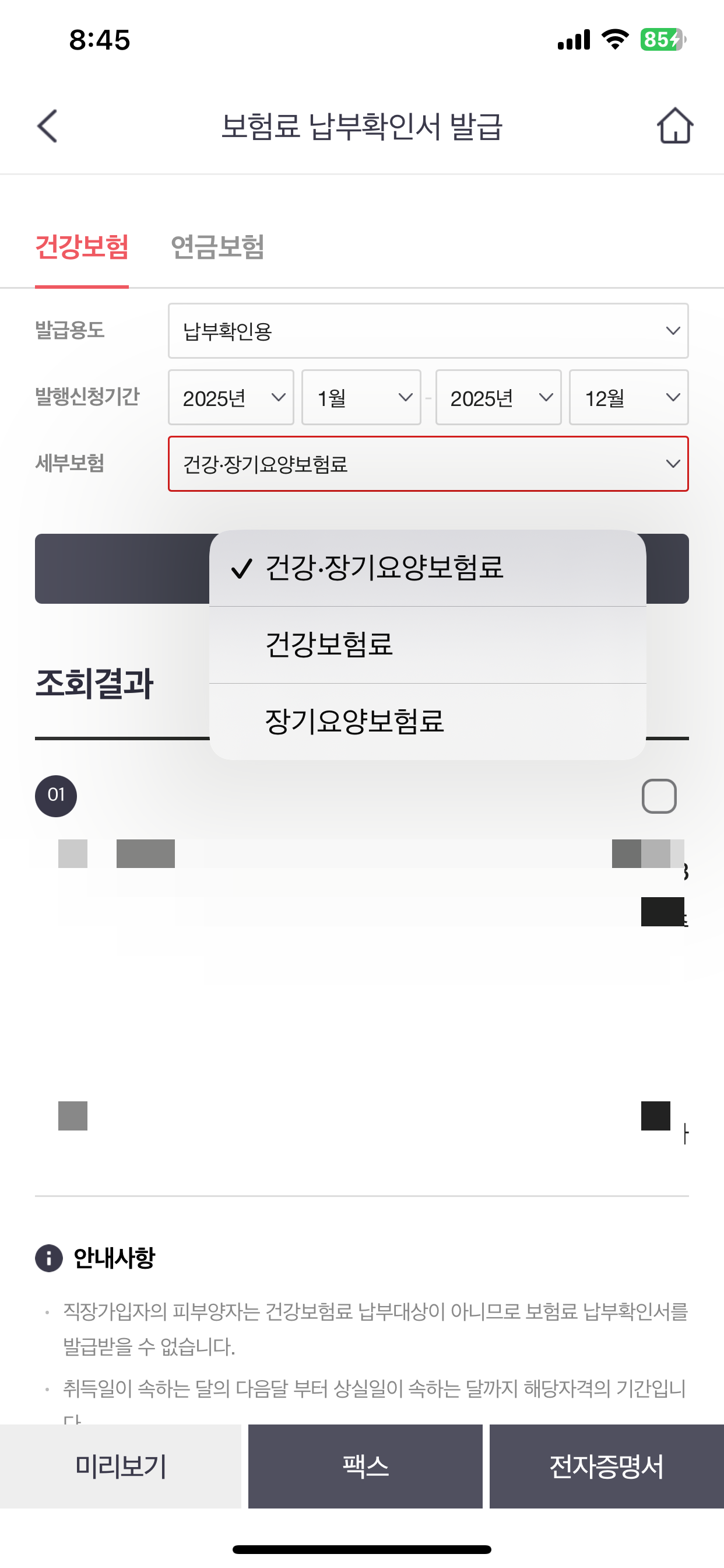 • 직장가입자의 피부양자는 건강보험료 납부대상이 아니므로 보험료 납부확인서를 발급받을 수 없습니다.