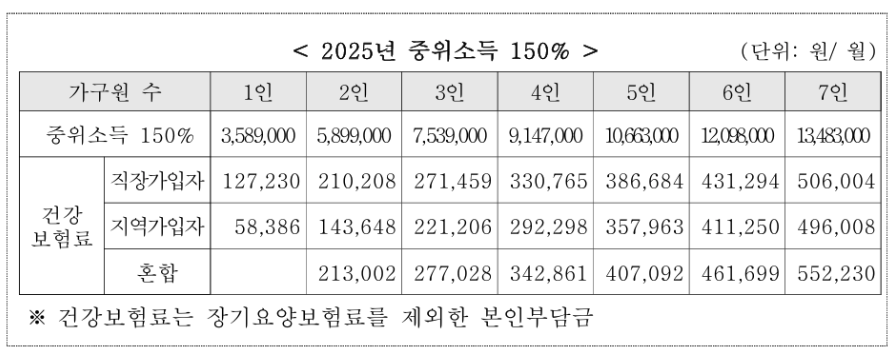 - 가구소득: 기준 중위소득 150% 이하 가구원 대상 (건강보험료로 확인).