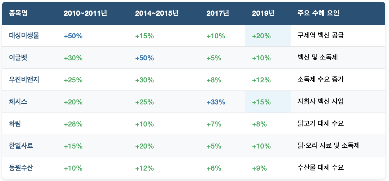 - 발병 초기(1~2주): 백신, 소독제 관련주 (대성미생물, 이글벳 등) 20~50%가까이 급등.