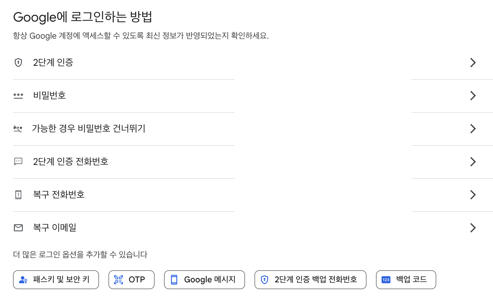 - otp 문제 발생시 빠르게 복구 할 수 있도록 미리 계정에 복구이메일 또는 휴대전화번호 등록을 해두는 것을 추천합니다.