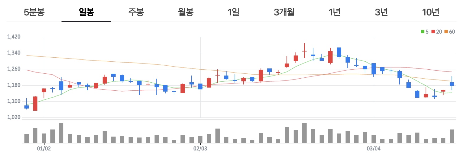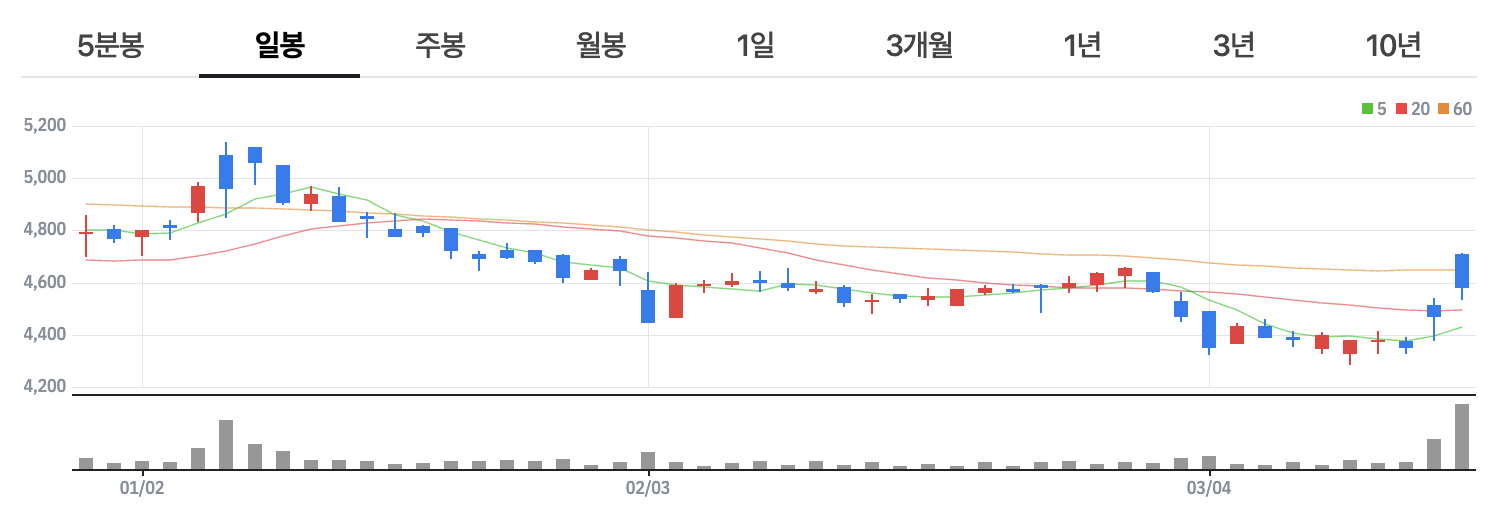 - 주가 움직임: 3월 15일 주가 5% 상승하며 3,200원대 기록. 3월 16일 거래량 15만 주로 안정적 흐름 유지.
