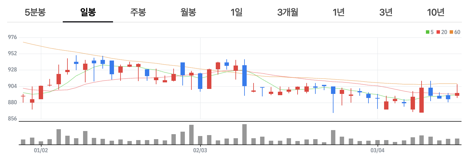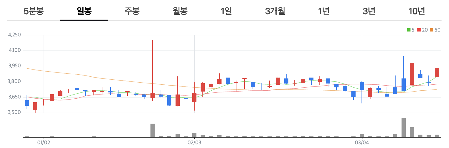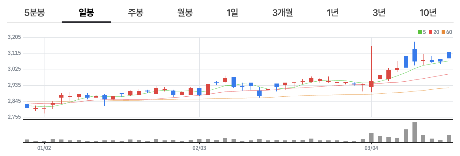 - 주가 움직임: 3월 14일부터 3일간 12% 상승하며 3,000원대 진입. 3월 16일 거래량 20만 주로 관심 증가.