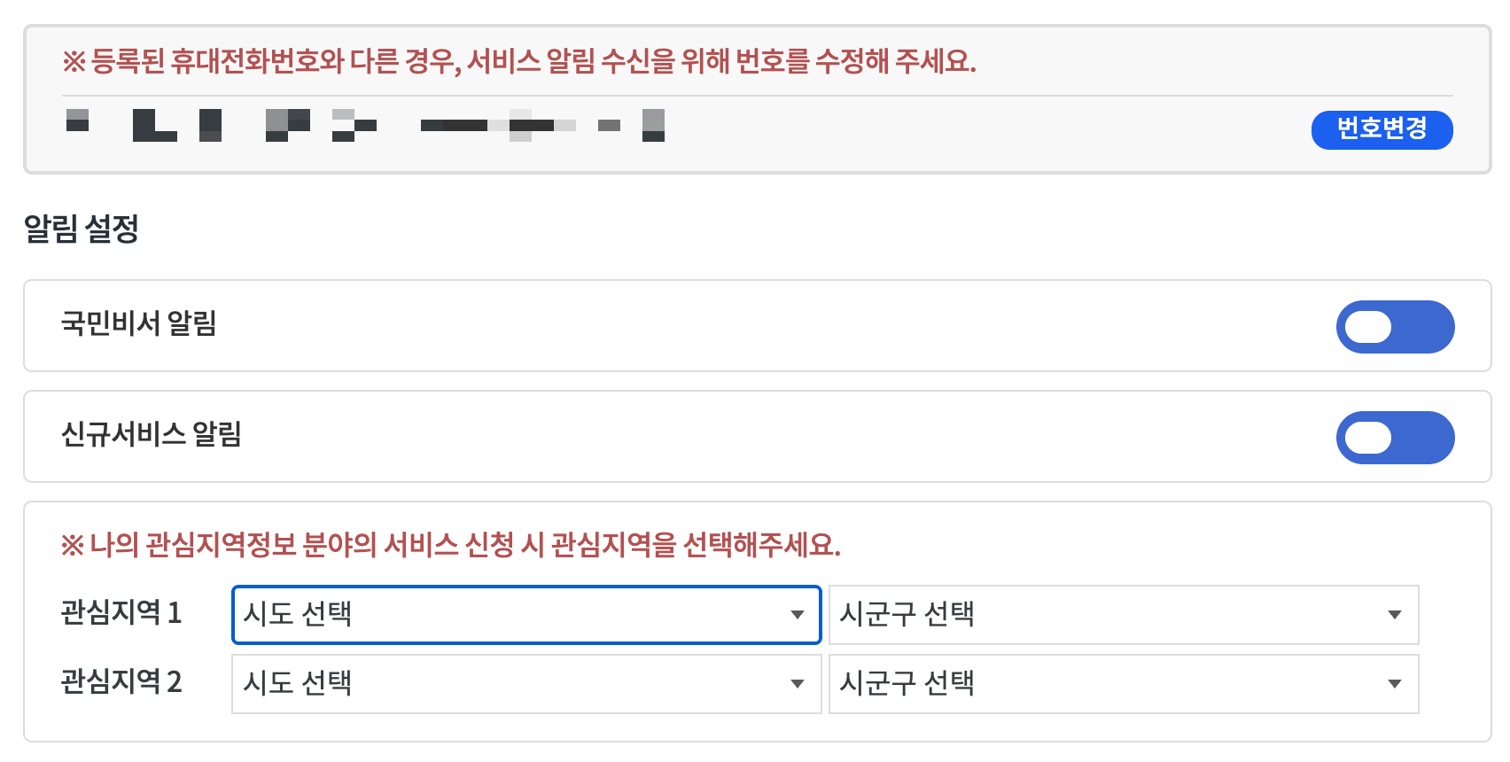 기존에 가입했던 이력이 있다고 해도 현재도 같은 번호를 사용하고 있는지 확인해서 실제 사용중인 전화번호로 변경하는 것이 반드시 필요합니다. 국민비서에서는 상당히 많은 알림서비스를 제공하고 있기 때문에 정확한 전화번호가 입력되어있어야 합니다.