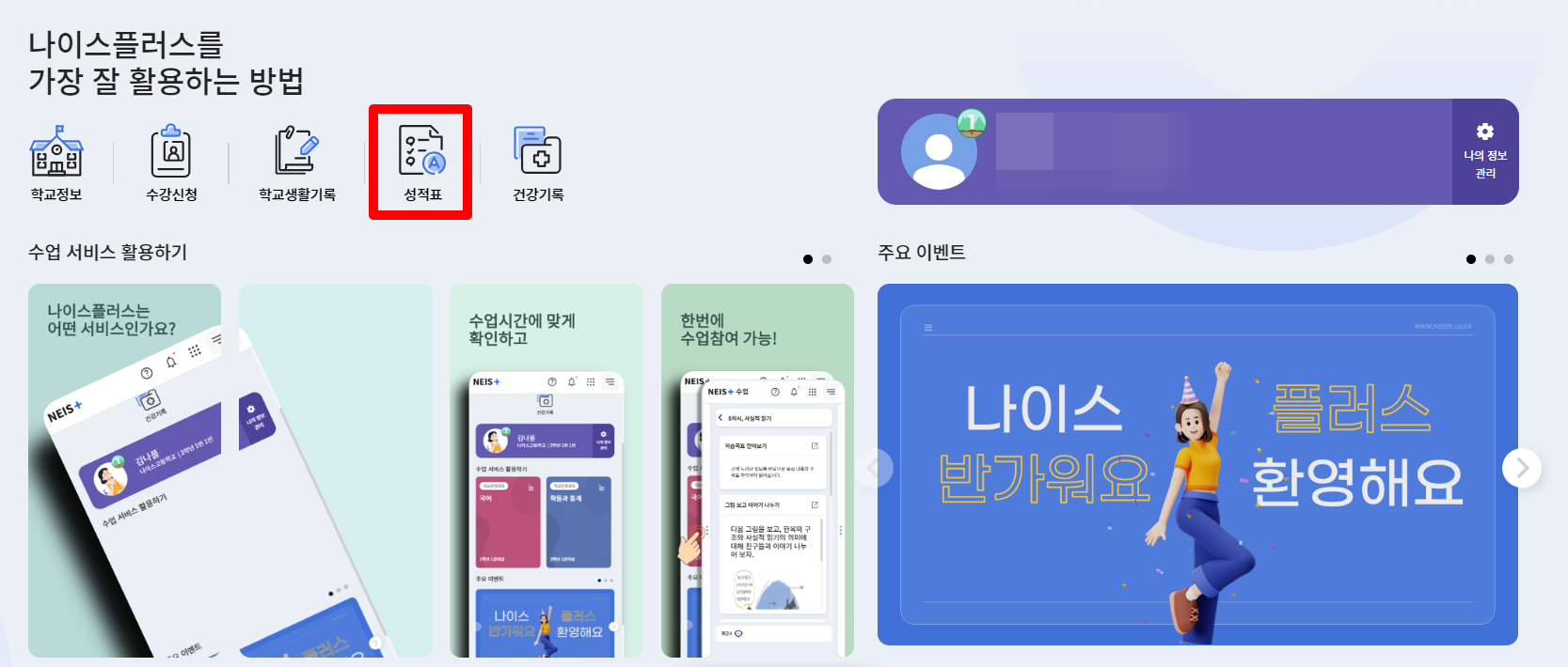 나이스 플러스 홈페이지를 통해서 다양한 학업 자료, 학교 내 안내 사항 등을 확인할 수 있는데요. 학업 성적이나 건강 상태, 출결 상황, 교내 학사 일정이나 급식 등 학교에 관련한 자료를 조회할 수 있습니다. 입시 기간에는 성적 조회를 간편하게 할 수 있는 사이트가 필요하지요. 나이스 학생서비스에서 간편하게 원하는 자료를 조회하세요.