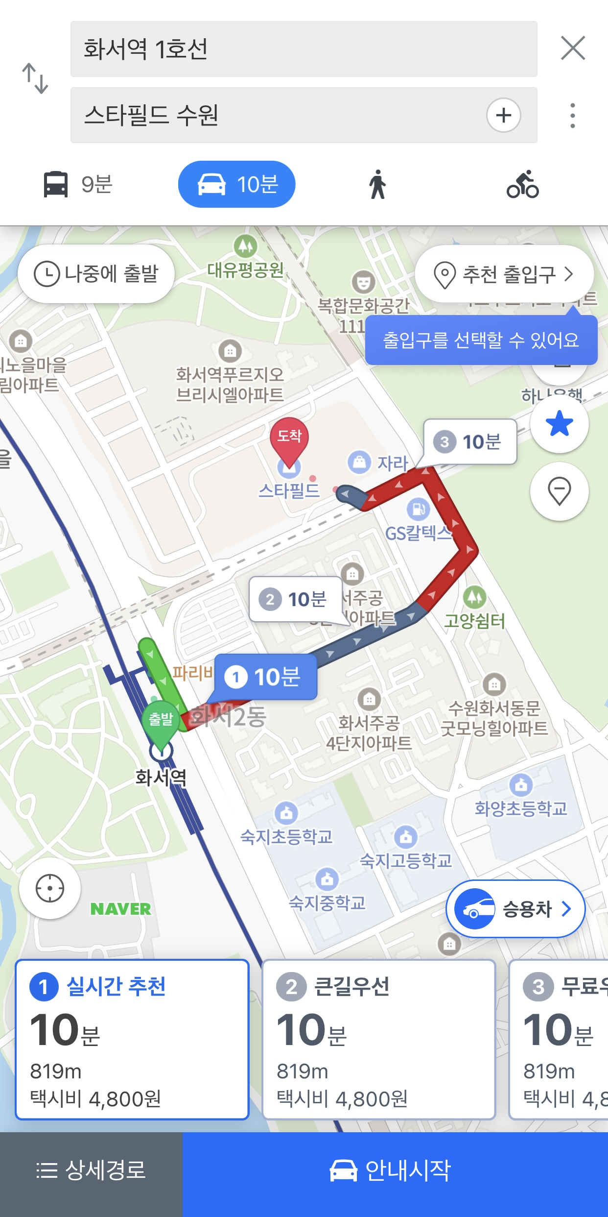 자동차의 경우에는 좀 더 다양한 경로가 지원되는데요. 실시간 추천 경로, 큰길 우선 경로 등 다양한 경로로 갈 수 있습니다. 소요되는 시간과 이동하는 거리, 택시 비용까지 알려주어 효율적인 선택을 도와줍니다. 안내 시작을 누르시면 내비게이션으로 전환되어 쉽고 편하게 경로 안내 서비스를 이용할 수 있어요.