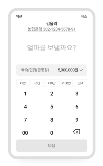 이체하고 싶은 금액을 입력하고 하단의 다음 버튼을 누르면 계좌번호 입력과 함께 가입하면서 등록해둔 숫자6자리 비밀번호 또는 생체인식으로 바로 송금이 가능합니다.