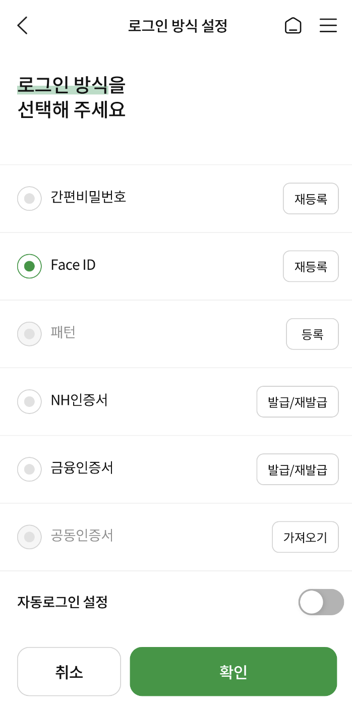 - 인증서 등록 : 금융인증서, 공동인증서, NH모바일인증 중 선택