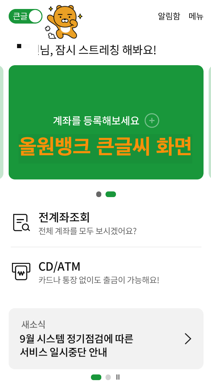 읽기 쉽게 글씨체를 크게하고 메뉴를 단순화한 모바일뱅킹 모드로 시니어 어르신분들, 시력이 약한 분들도 사용하기 편리하도록 고안된 기능입니다.