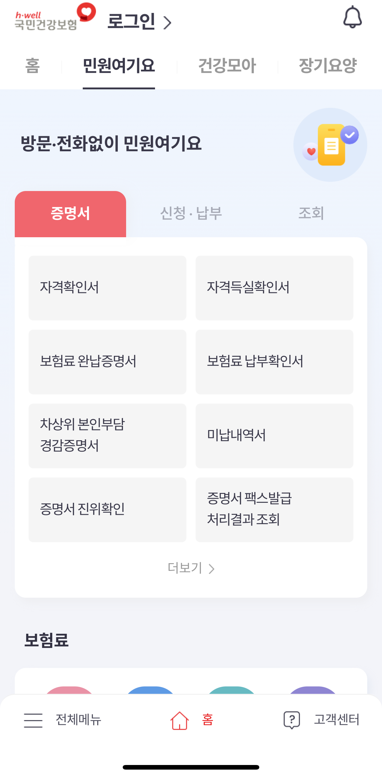 - 각종 민원 신청 및 발급서류 조회: 자격득실 확인서, 보험료 납부확인서 등