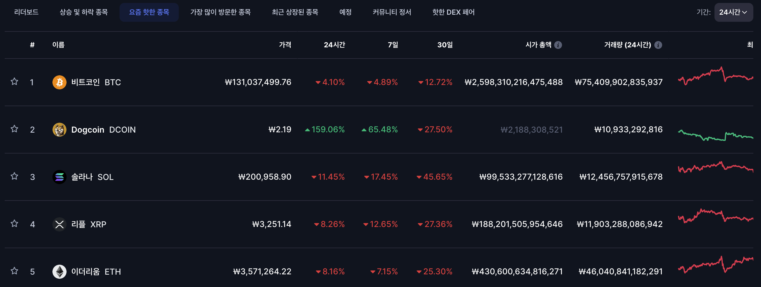 - 시가총액: 도지코인 시가총액은 약 350억~400억 달러 사이로 전체 암호화폐 순위 8위~10위권 유지하고 있음. 시장 전반이 급락하는 오늘도 핫한 종목에 랭크됨.