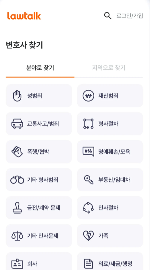 로톡앱 메인화면이나 상단 메뉴에서 상담분야를 먼저 선택합니다. 분야를 정확히 선택해야 해당 분야 경험이 풍부한 변호사 목록이 자동으로 필터링됩니다.