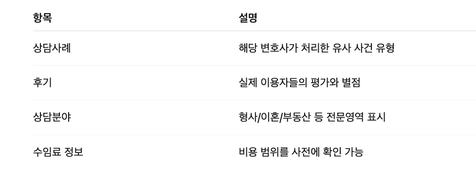 꿀팁: 상담을 요청하기 전에 최소한 후기 5개 이상은 꼭 읽어보는 것을 추천합니다. 후기에는 실제 사건에 대한 평가와 함께 변호사의 대응에 대한 내용이 담겨 있어서 상당부분 믿을 수 있는 선택 기준이 됩니다.