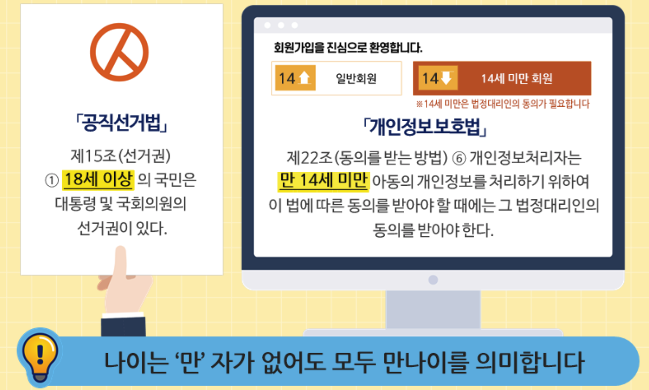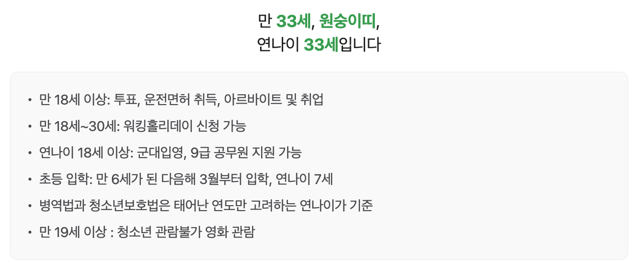 - 법적 기준: 민법, 행정법 등 모든 법령에서 나이는 특별 규정이 없으면 "만나이"로 계산.