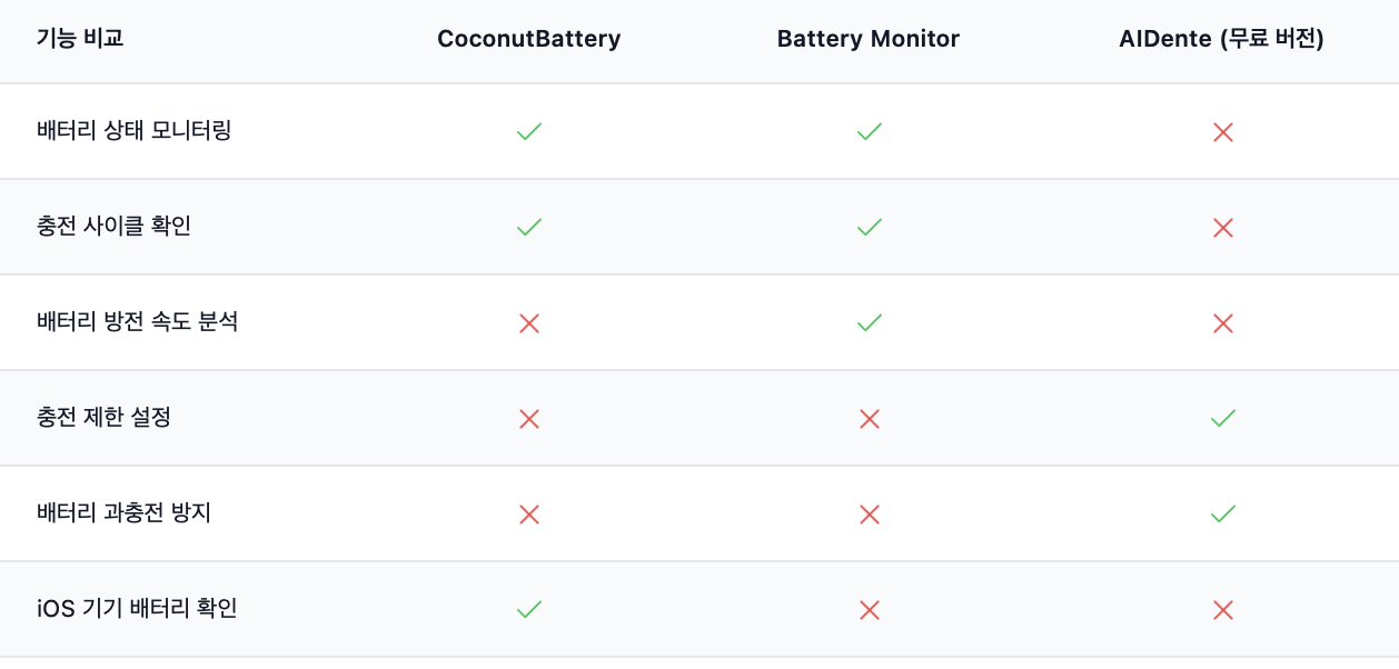 맥북의 배터리 수명을 연장하고 효율적으로 관리하고 싶은 사용자에게 적합하지만 배터리만 체크 하는데 유료버전이 부담스러울 때 사용할 수 있는 대안 앱으로 코코넛배터리와 배터리 모니터, AlDente도 고려해볼 수 있습니다. 그 중에서도 CoconutBattery + AlDente 무료 버전을 함께 사용하면 배터리헬스3의 기능을 대체하기에 적합합니다. 무료 다운로드를 시작하세요.