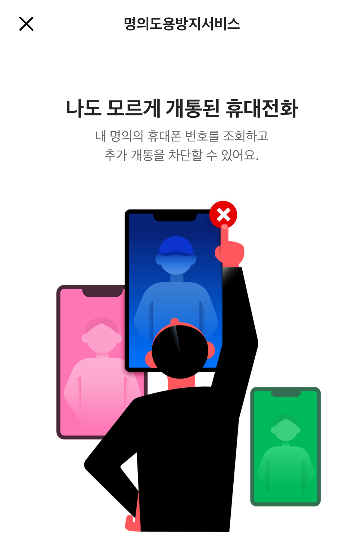 - 명의도용방지서비스 신청 요청: 직원에게 명의도용방지서비스 신청을 요청합니다. SKT뿐만 아니라 타 통신사에서의 개통도 제한하도록 설정을 요청합니다.