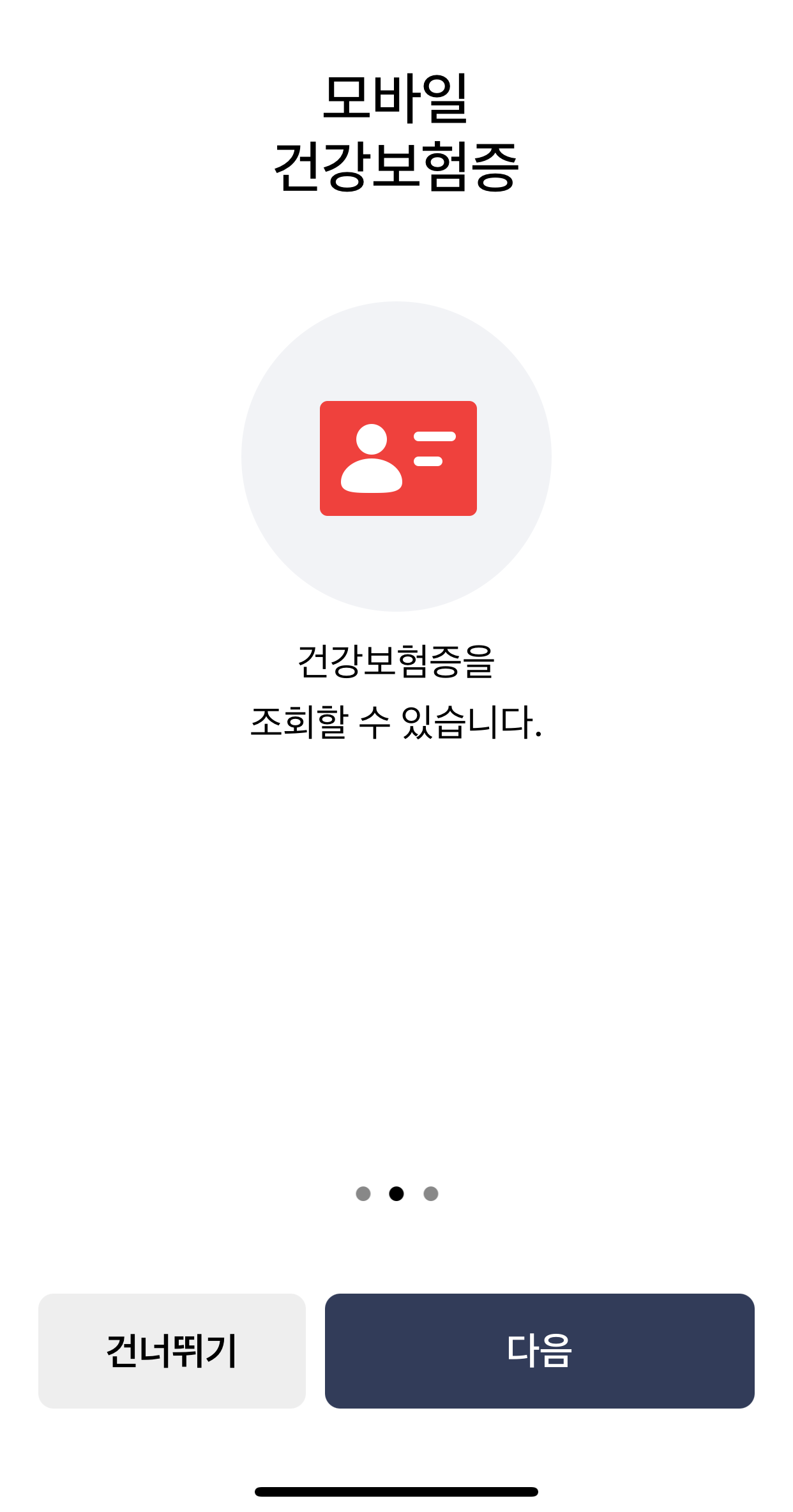 안내 문구는 확인하고 빠르게 다음을 누르던가 하단의 건너뛰기를 통해서 한 번에 스킵할 수 있습니다. 모바일 건강보험증 앱 시작할 때 편의성을 위해 생체인증은 등록하는 것을 추천합니다. 페이스아이디(안면인식) 또는 지문인식등을 통해 편하게 접근할 수 있습니다.