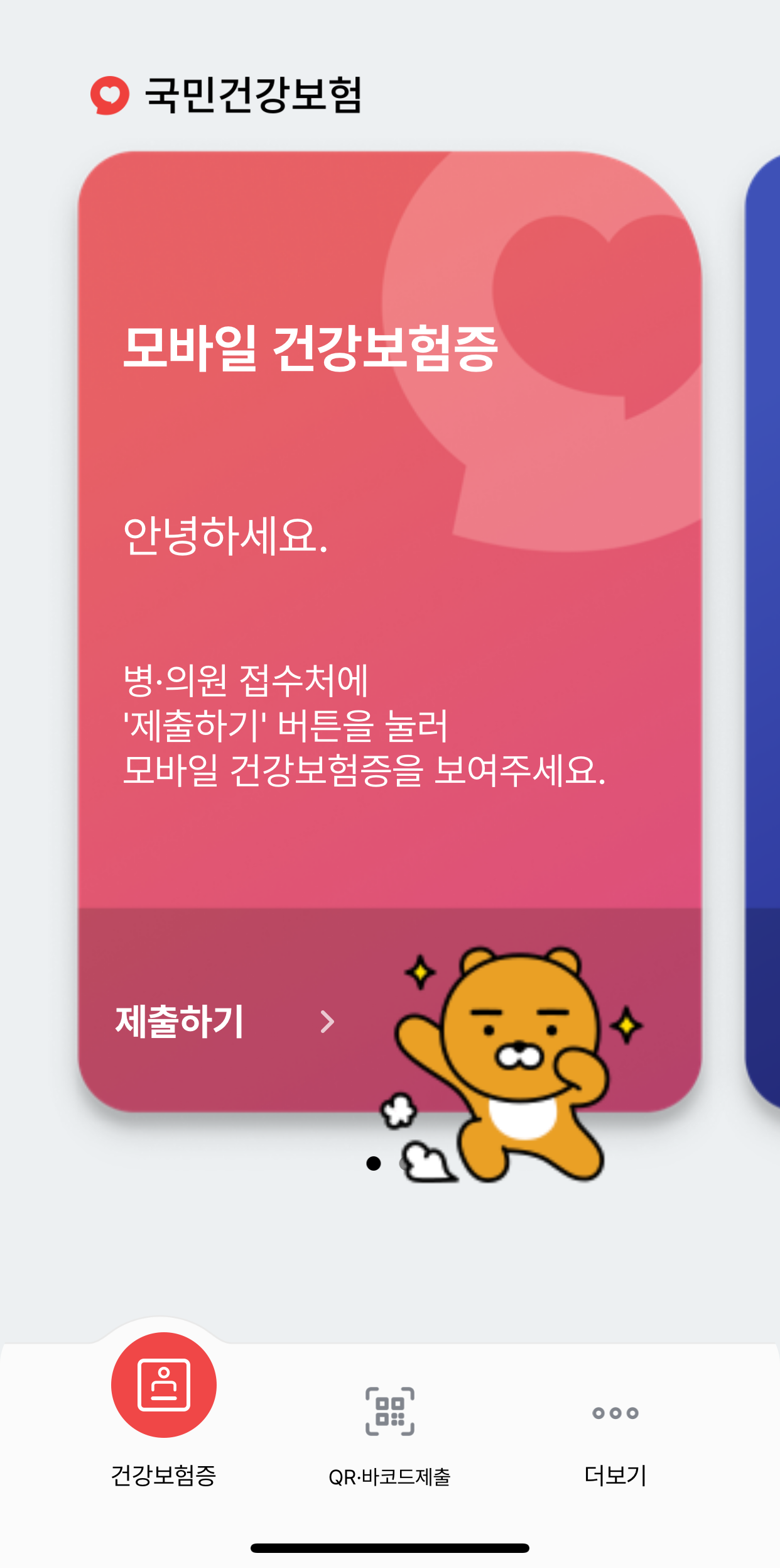 처음 건강보험증 앱을 설치하고 나면 그때그때 해당되는 팝업 문구를 확인할 수 있습니다. 앞서 언급했듯 부정수급은 범죄이니 내용을 확인하고 다시보지않기 또는 닫기를 눌러서 홈화면으로 이동해주세요.