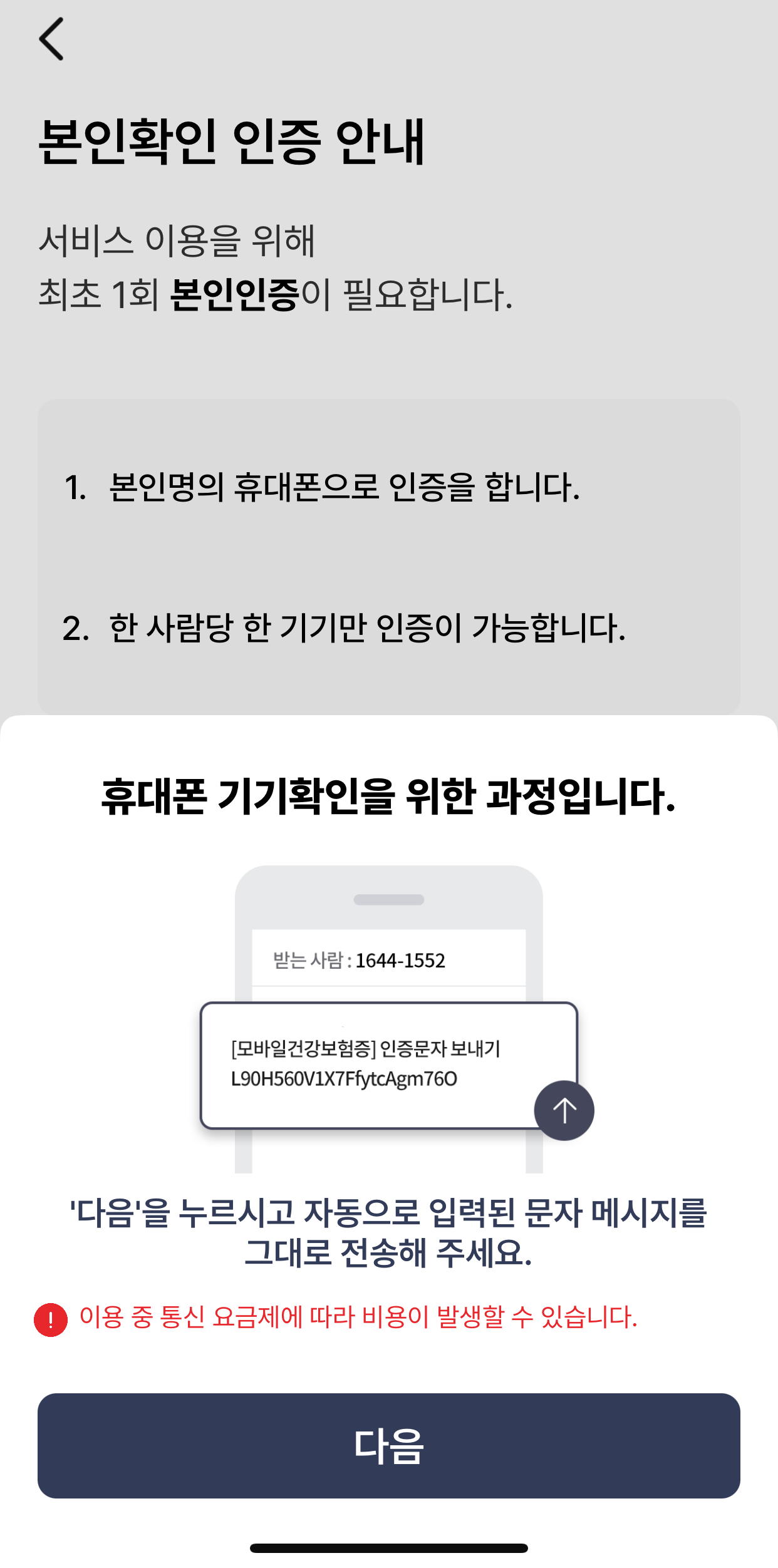 이제 국민건강보험 관련 내용을 사용하기 위한 본인인증을 거쳐야 합니다. 최초 1회 처음 사용할 때 한 번 휴대폰으로 인증하면 이후에는 바로 접근이 가능합니다. 한 사람당 하나의 기기만 인증이 가능하기 때문에 내 명의 휴대폰이 두 개라고 할지라도 모바일 건강보험증 어플 설치는 하나의 폰에서만 가능하니 참고하세요.
