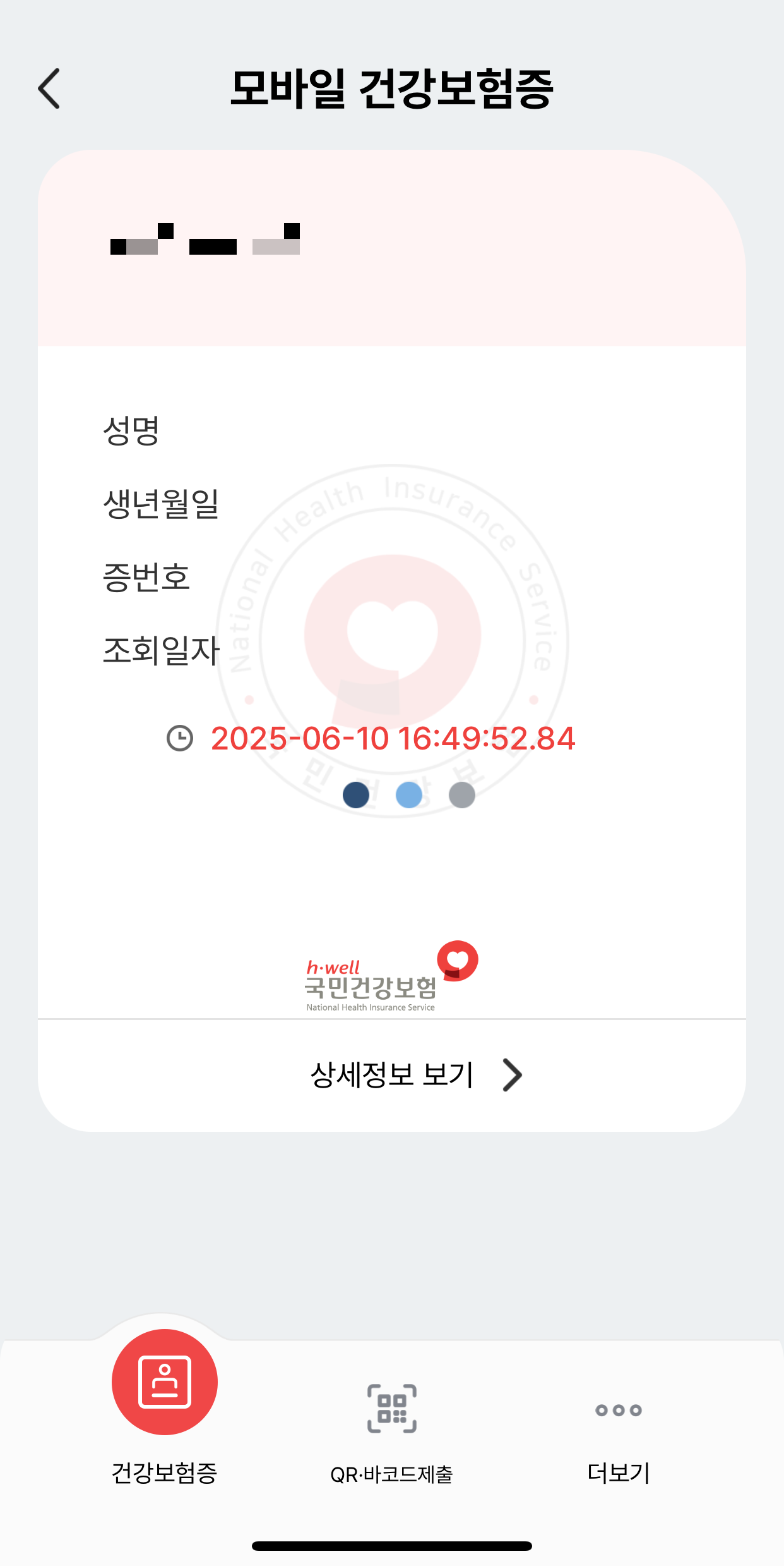 병원이나 카페 등 공공장소에서 모바일 건강보험증을 사용할 때는 LTE/5G 네트워크를 권장합니다. 공용 와이파이는 보안 위험이 클 수 있어 권장하지 않습니다. - 앱 최신 버전 유지
