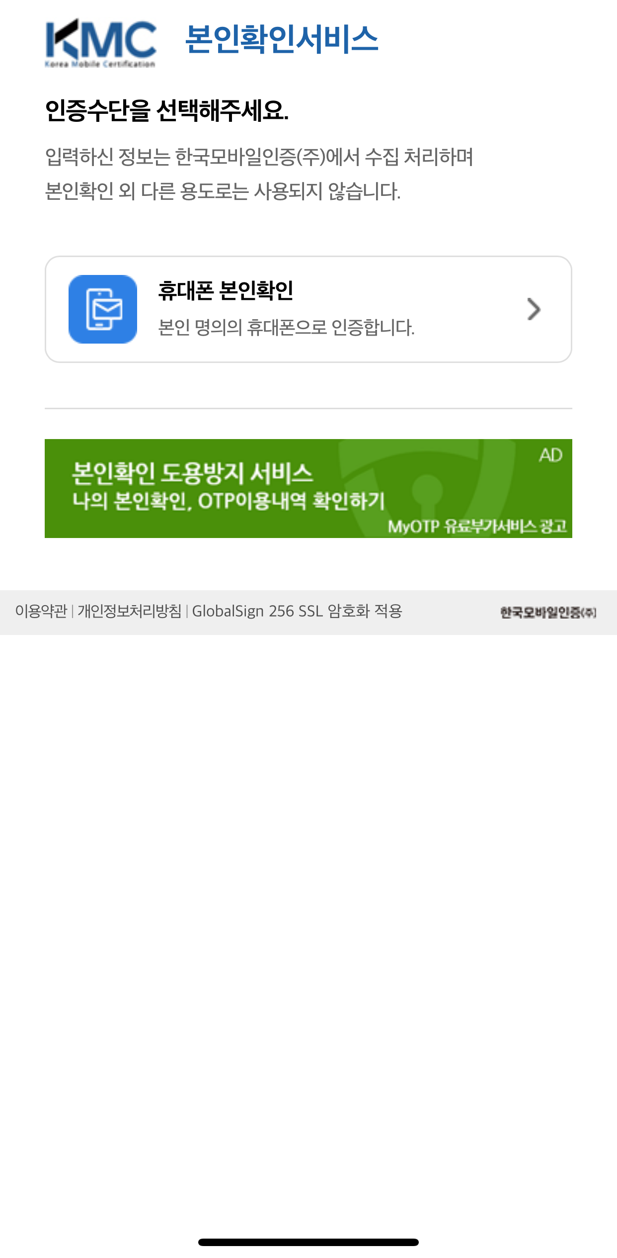 본인인증은 본인 명의 휴대폰으로 통신사를 통해 인증하는 방식을 사용합니다. 휴대폰 기기 확인을 위해서 임의 문자와 숫자가 조합된 문자를 휴대폰으로 수신하면 바로 전송하는 방식으로 인증하고 본인확인을 진행합니다.