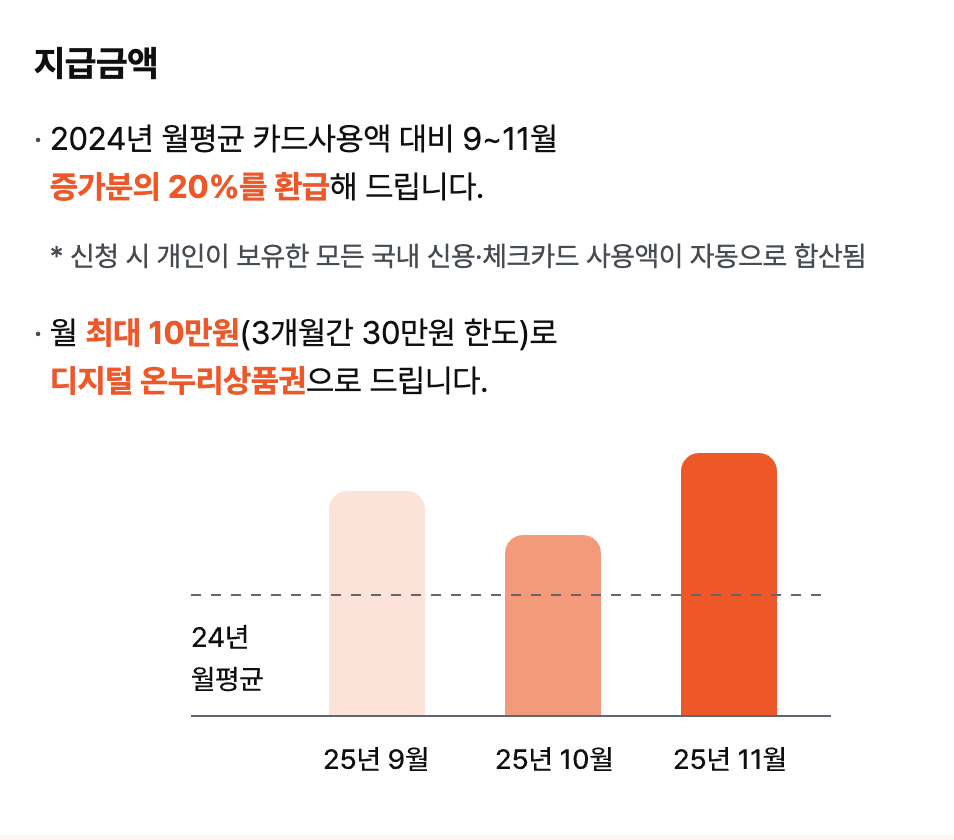- 전년도 월평균 대비 올해 9~11월 신용카드 사용액이 증가한 경우, 증가분의 20%를 현금성으로 사용할 수 있는 디지털 온누리 상품권으로 최대 30만원까지 페이백 해주는 제도입니다.