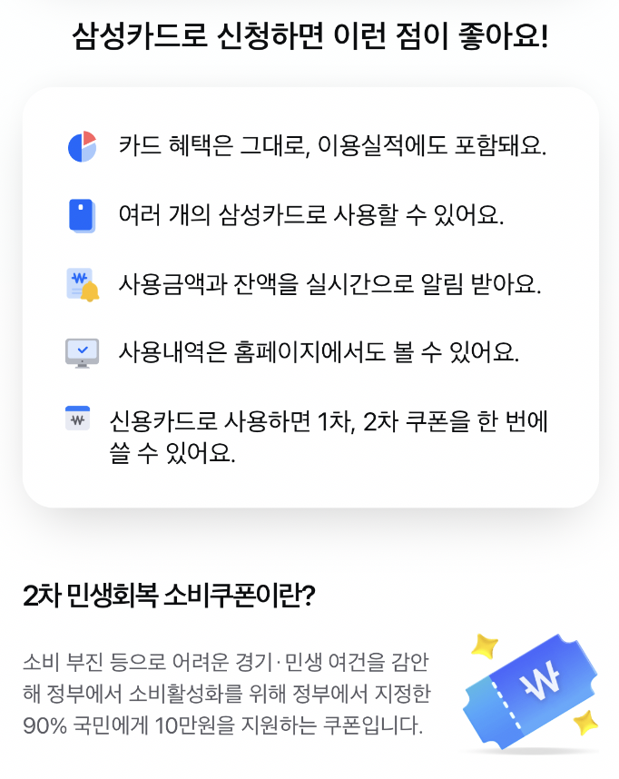 📌 동일한 삼성신용카드로 신청하는 경우 1차 소비쿠폰 잔액과 2차 소비쿠폰 지급액은 합산해서 사용할 수 있습니다.