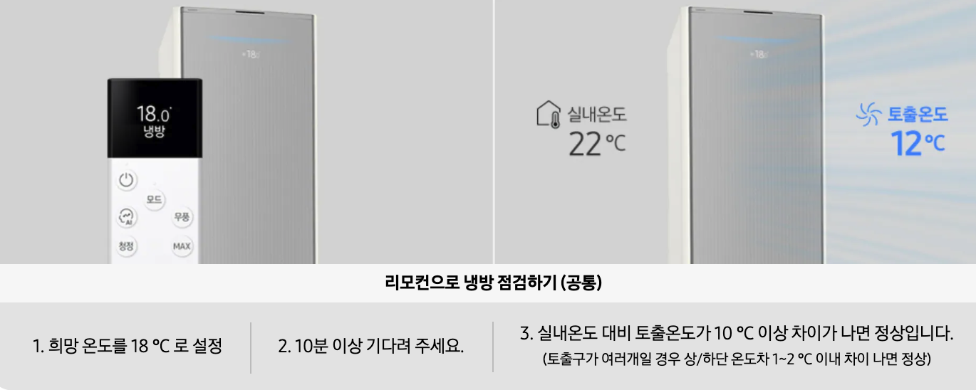 실내온도 대비 토출 온도가 10도 이상 차이나면 정상입니다. (토출구가 여러개인 경우 상하단 온도차 1~2도 이내 차이나면 정상)
