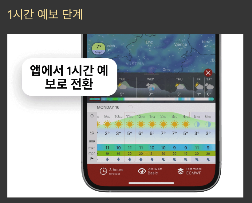 - ECMWF(유럽), GFS(미국), ICON(독일) 모델 중 선택 가능. 한국 장마철에는 ECMWF가 정확도가 높다는 평가.