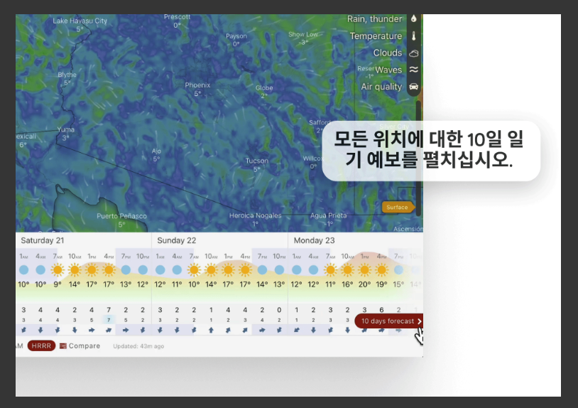 - 시간별 예보: 1시간 단위로 최대 10일간의 예보 확인 가능.