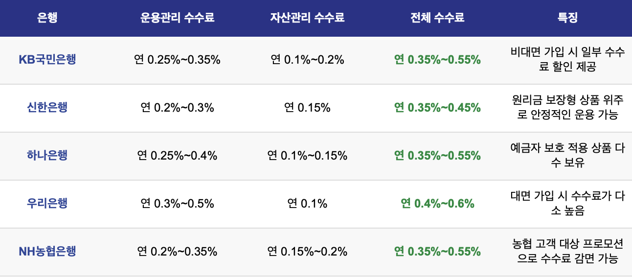 - 자산관리 수수료: 연 0.1%~0.25% (대면 가입 시)