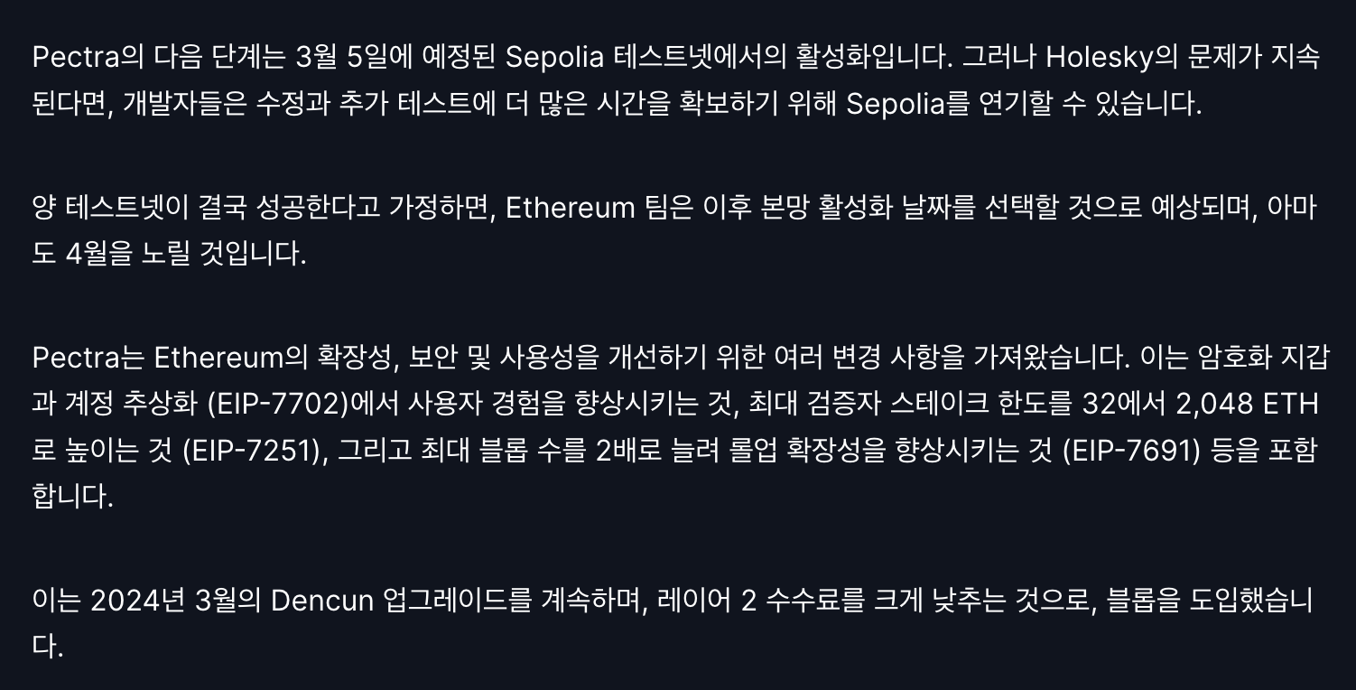 이더리움 재단은 2월 14일 Pectra 업그레이드 테스트넷 일정을 발표했습니다. (2월 26일 Holesky, 3월 5일 Sepolia). 이 업그레이드는 데이터 가용성 확장과 스마트 계정 전환을 통해 네트워크 효율성을 높일 계획입니다. 매체에 언급된 연구원 저스틴 드레이크는 ETH가 초음속 화폐로 돌아올 가능성을 언급하기도 했는데요, 현재의 약세 분위기와 "잃어리움" 논란 속에서 이 호재는 아직 가격에 반영되지 않고 있습니다.