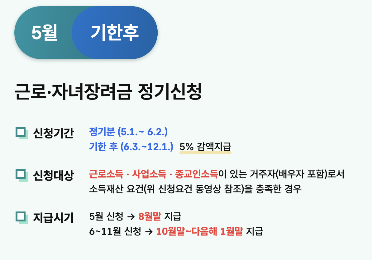 - 자녀장려급 지급일: 5월 정기신청 대상자는 8월말 지급됩니다.