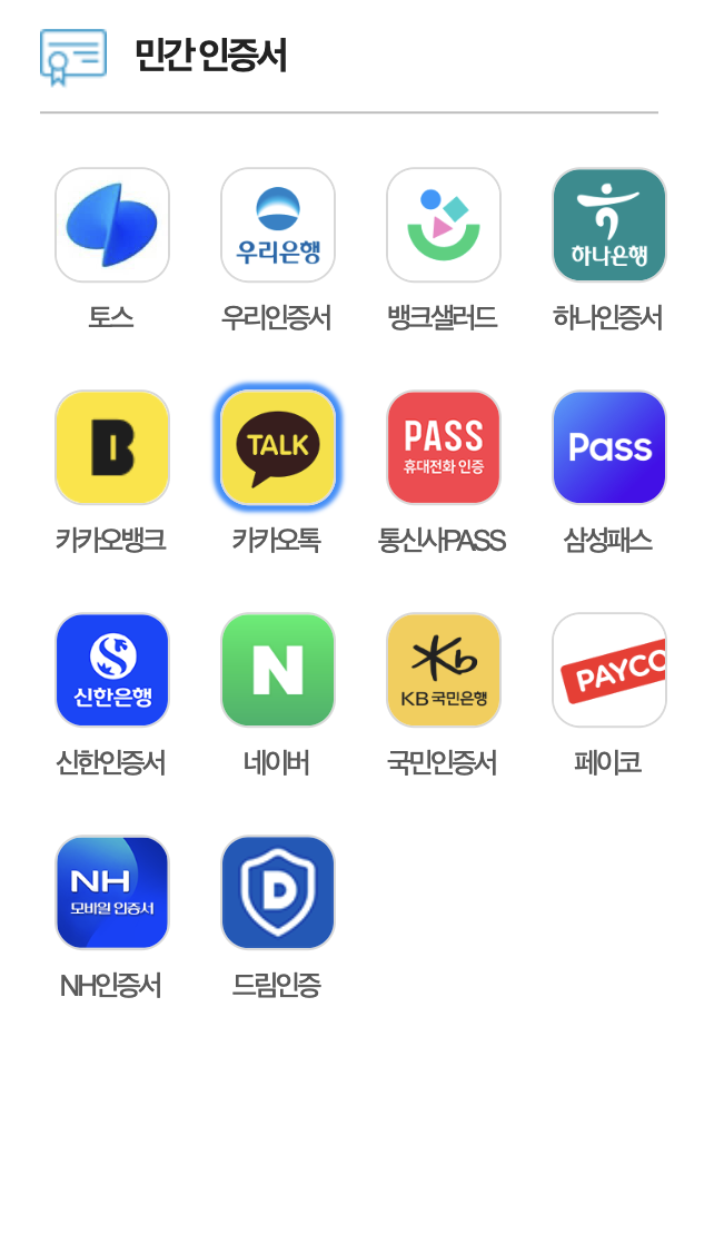 - 간편인증: 카카오뱅크, 카카오톡인증서, KB국민인증서, 네이버인증서, 신한은행인증서, 드림인증, 우리인증서, 페이코, NH인증서, 뱅크샐러드, 토스, 삼성패스, 하나인증서 중 자주 사용하는 인증방식을 선택하면 됩니다. 통신사 PASS 앱으로도 간편인증이 가능하지만 skt 이용자의 경우 해킹 사건이 마무리 되지 않아 문제가 생길 수 있으니 다른 인증서 사용을 권장합니다.