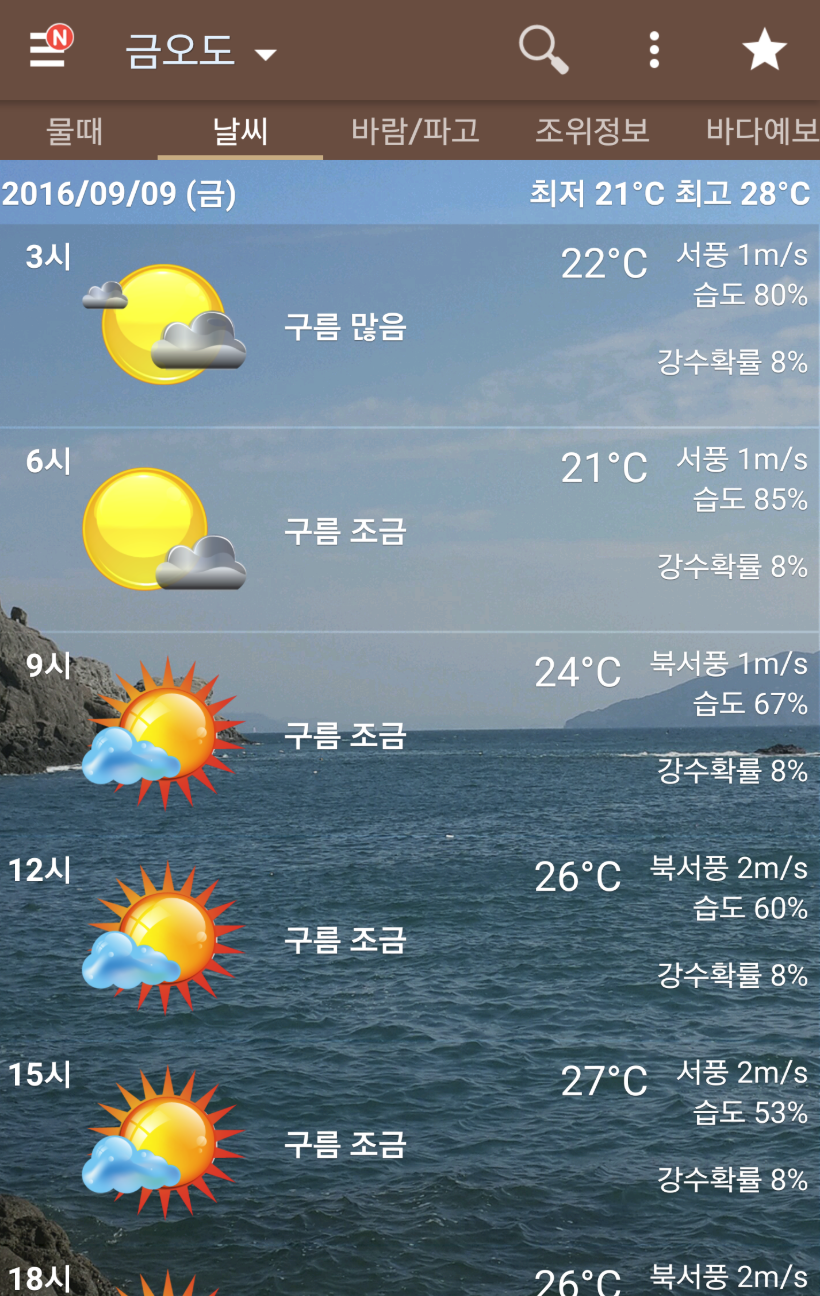 - 파도 높이, 바람 방향, 일출/일몰, 조류 정보