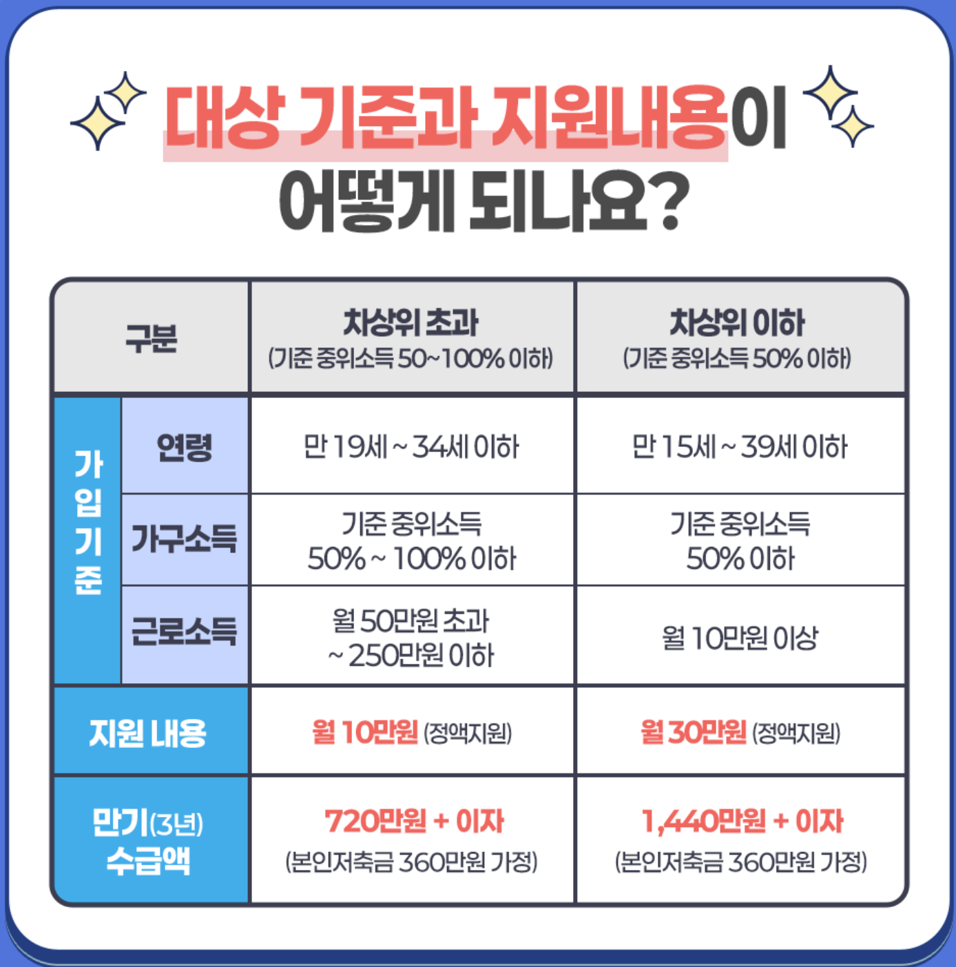 - 매달 10만원 저축 시 → 정부가 최대 30만원 추가 적립