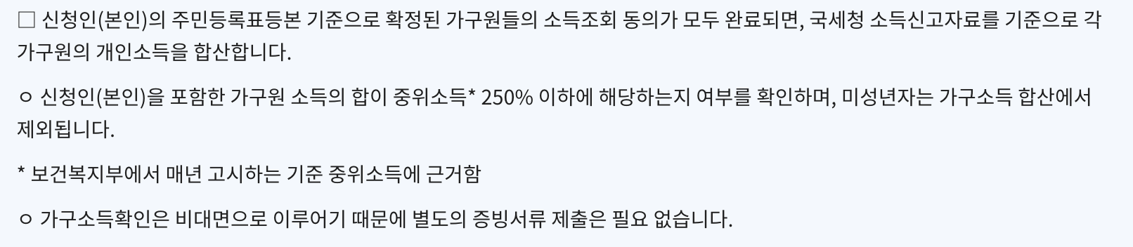 - 가구원 전원의 직전 연도(또는 전전년도) 소득 합계 계산.
