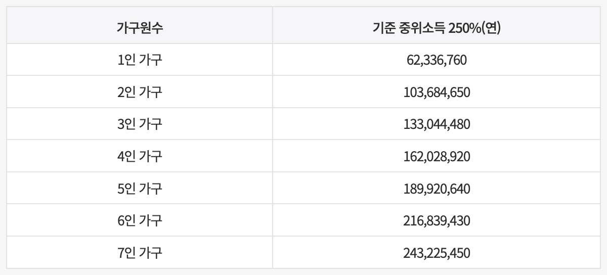 - 위 표에서 가구원 수에 맞는 250% 기준과 비교.