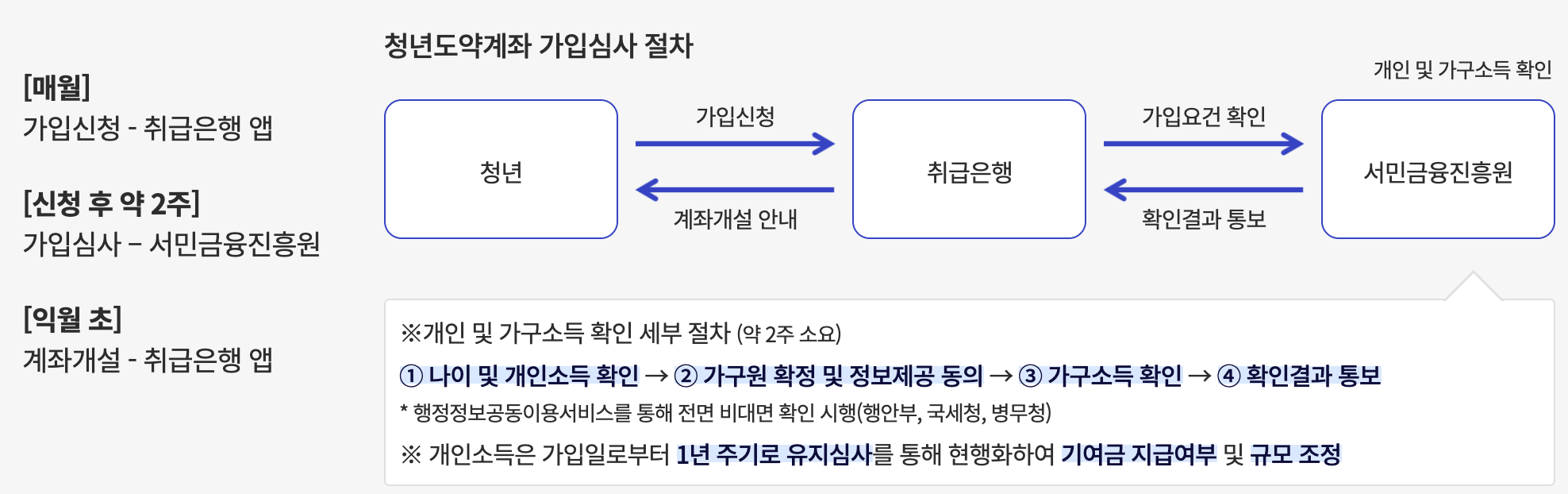 (가구원기준: 청년 본인, 본인의 주민등록표 등본상 배우자, 부모, 자녀, 미성년 형제/자매) - 저소득층(연소득 2,400만 원 이하)은 정부 기여금을 더 받을 수 있음.