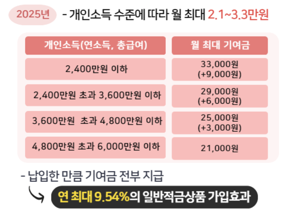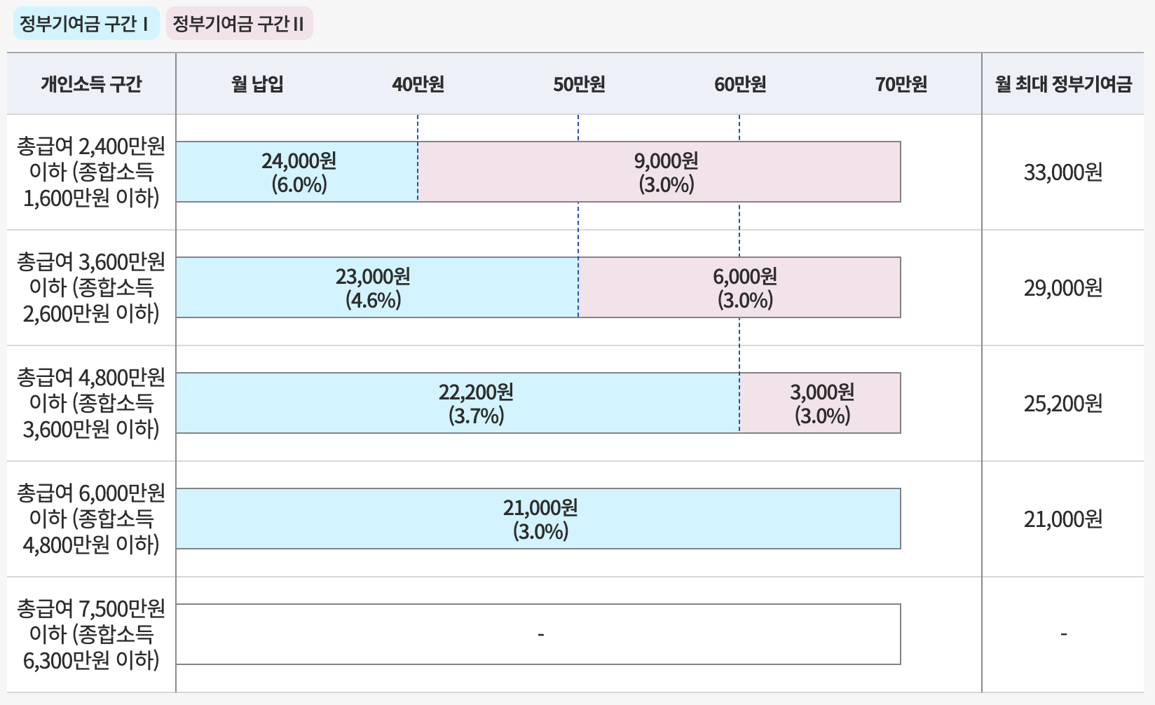 - 연소득 2,400만 원 이하: 정부 기여금을 최대한 받을 수 있는 구간으로, 가장 많은 지원 혜택을 받을 수 있음