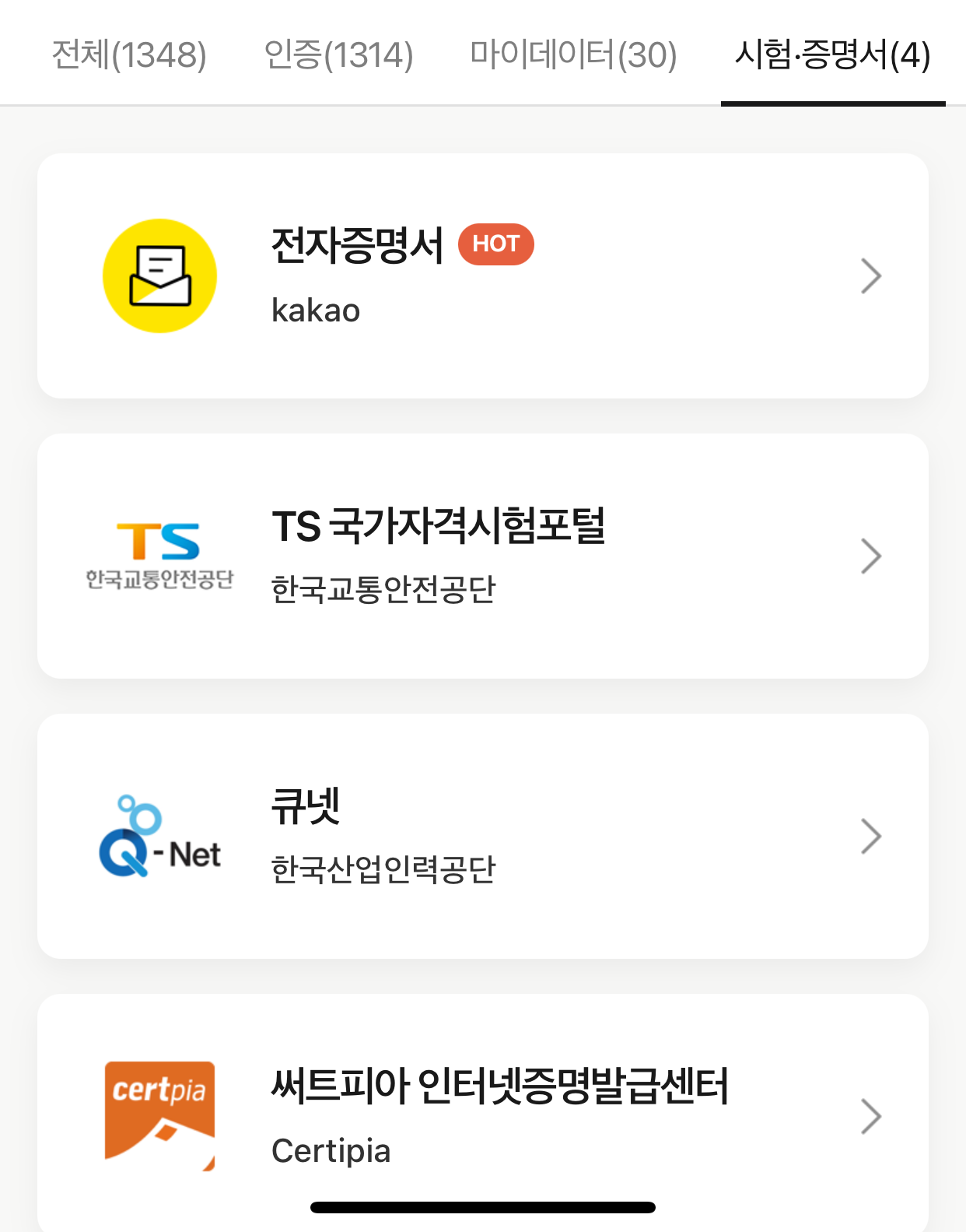 카카오톡 인증서로 사용할 수 있는 인증, 마이데이터 시스템, 시험결과 조회 증명과 자격증명서는 총 1348가지로 지속적으로 추가되고 있습니다. 대표적인 전자문서들을 살펴봐도 일상에서 종종 필요해서 찾게 되는 문서들을 확인할 수 있습니다.