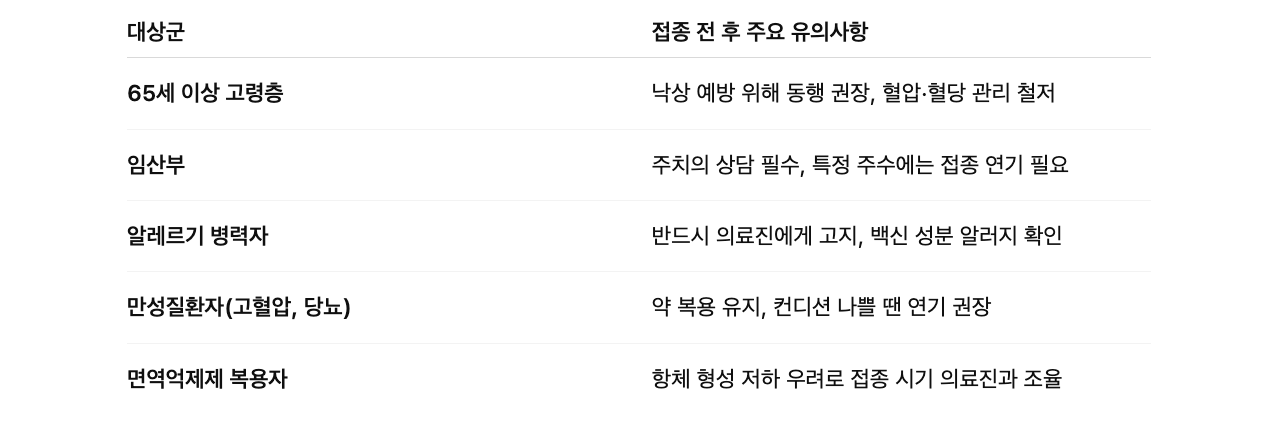 - 접종 당일 컨디션 확인 (고열, 피로 시 연기 권장)