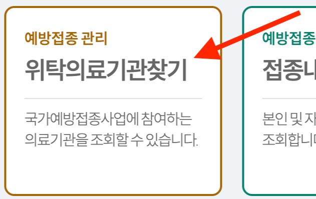 - 예방접종도우미 사이트 접속 → 상단의 ‘예방접종기관 찾기’ 메뉴 클릭
