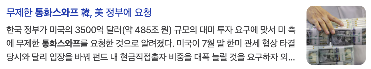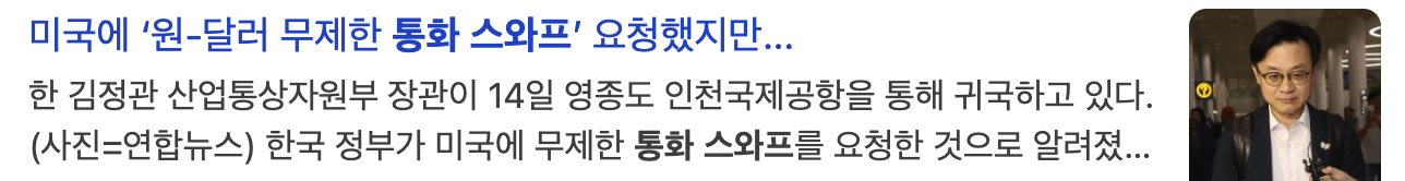 이미 2025년 들어 달러당 1,400원대를 넘나들고 있는 상황에서 통화 스와프 없이 외환 시장이 불안정해지면 수입 물가가 상승하고 → 인플레이션 → 소비 위축으로 이어질 수 있습니다. - 수출 기업(삼성, 현대 등)은 달러 수입이 늘어 이득을 볼 수 있지만, 중소기업이나 가계는 대출 이자 부담이 커져 경제 성장률이 둔화될 가능성도 있습니다.