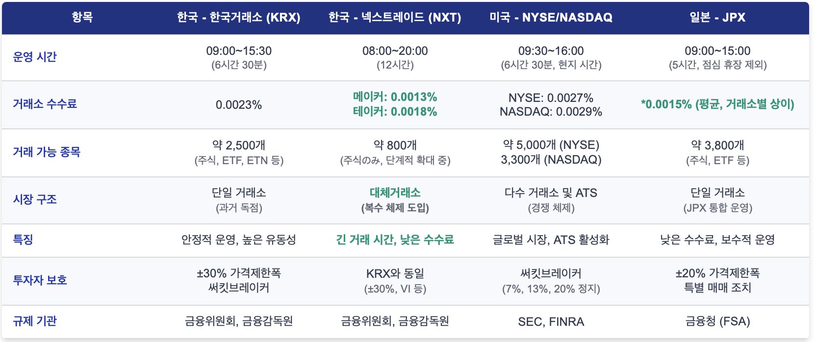 - JPX는 평균 0.0015%로 비교적 낮은 수수료를 유지하며, 약 3,800개 종목을 거래합니다. 점심 휴장(11:30~12:30)을 제외한 5시간 운영으로 보수적인 구조를 보입니다.