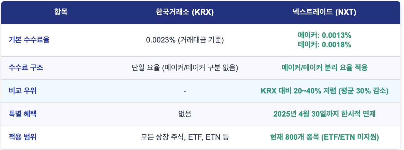 - 넥스트레이드 (NXT): 메이커 0.0013%, 테이커 0.0018%로 세분화된 요율을 적용하며, 평균적으로 KRX보다 30% 저렴합니다. 동일한 1억 원 거래 시 메이커는 1,300원, 테이커는 1,800원의 수수료가 부과됩니다. 또한, 2025년 4월 30일까지 한시적 면제로 초기 투자 유인을 강화하고 있습니다.
