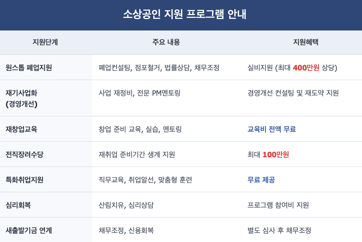 - 점포철거비, 원상복구비, 법률자문, 채무조정 등 최대 400만원 상당 비용 지원