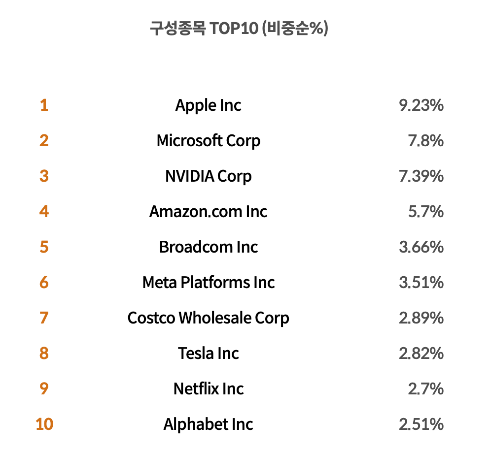 - 특징: 미국 S&P 500 지수를 추종하며 애플, 마이크로소프트 등 대형 기술주와 안정적인 배당주를 포함.