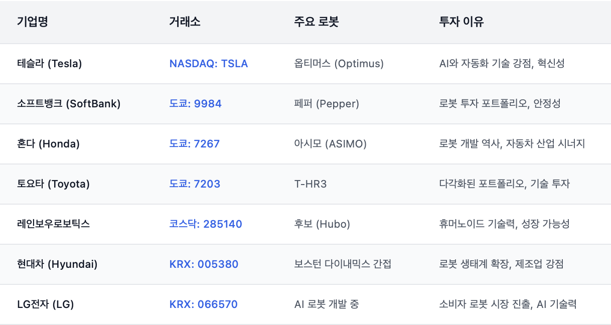 - 투자 포인트: 상장 기업 (KRX: 005930)으로, 막대한 자본력과 글로벌 네트워크를 활용한 로봇 사업 확장이 기대됨. 240조 원 투자 계획(2021-2024)의 일환으로 안정성과 성장성을 동시에 제공.